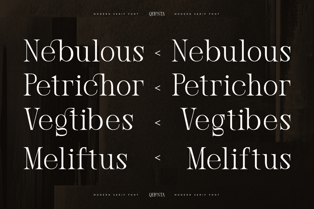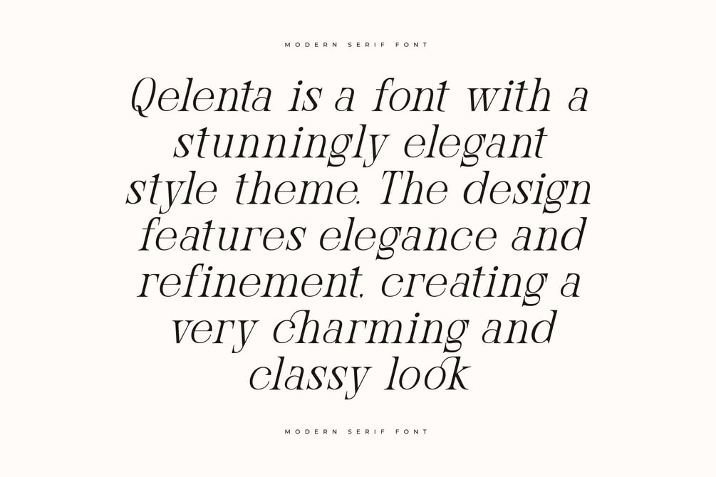 Qelenta exudes contemporary elegance and sophistication. This modern serif font is crafted with precision, offering the perfect balance between sleek lines and smooth curves. Each character is carefully designed to reflect a blend of classic and modern aesthetics, making it an ideal choice for high-end branding and editorial projects.